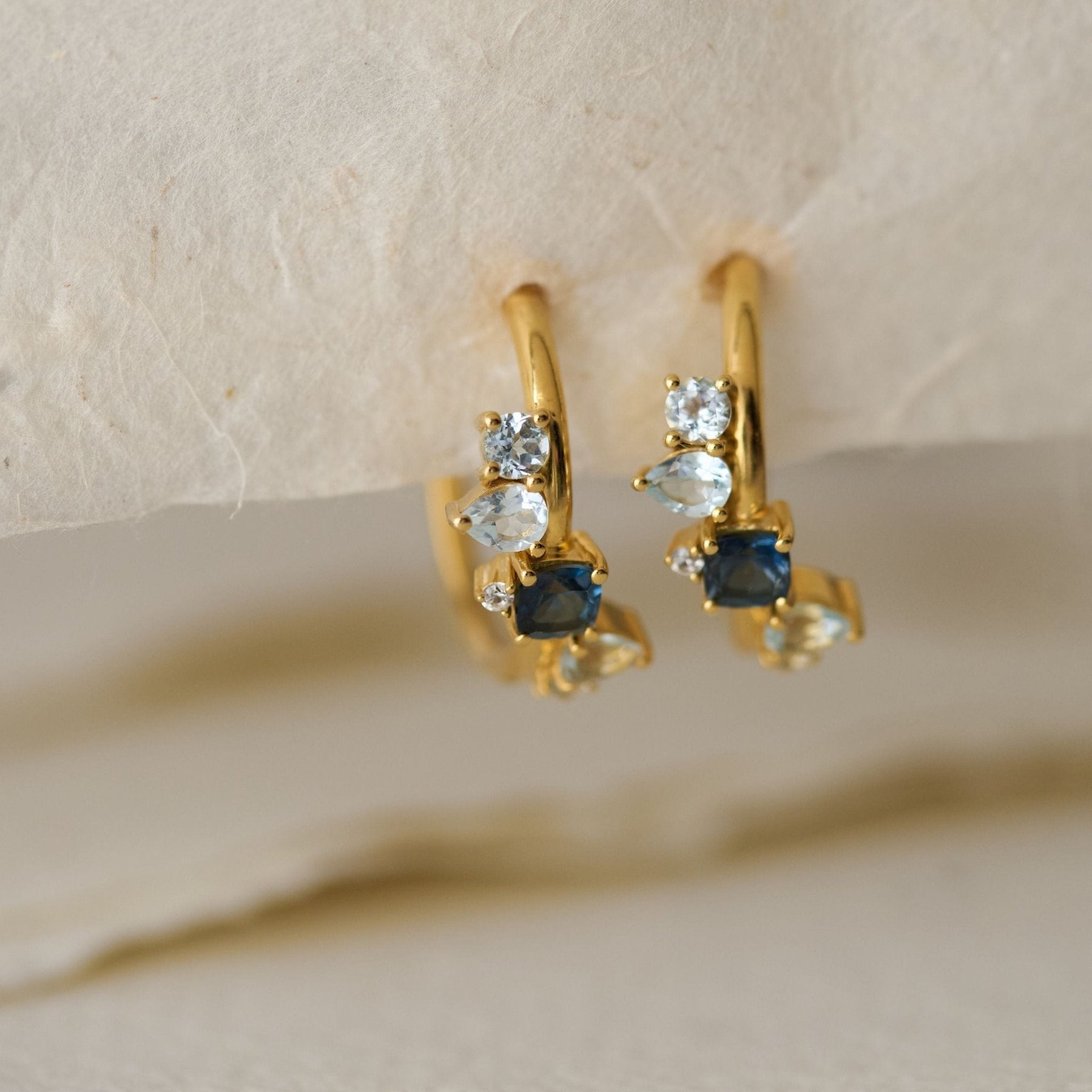 The Zaria Earrings feature a stunning gradient of London blue, sky blue, and white topaz gemstones set in sterling silver with 18ct gold vermeil. These 2cm handmade earrings showcase the natural transition from night to dawn through carefully arranged gradient design.