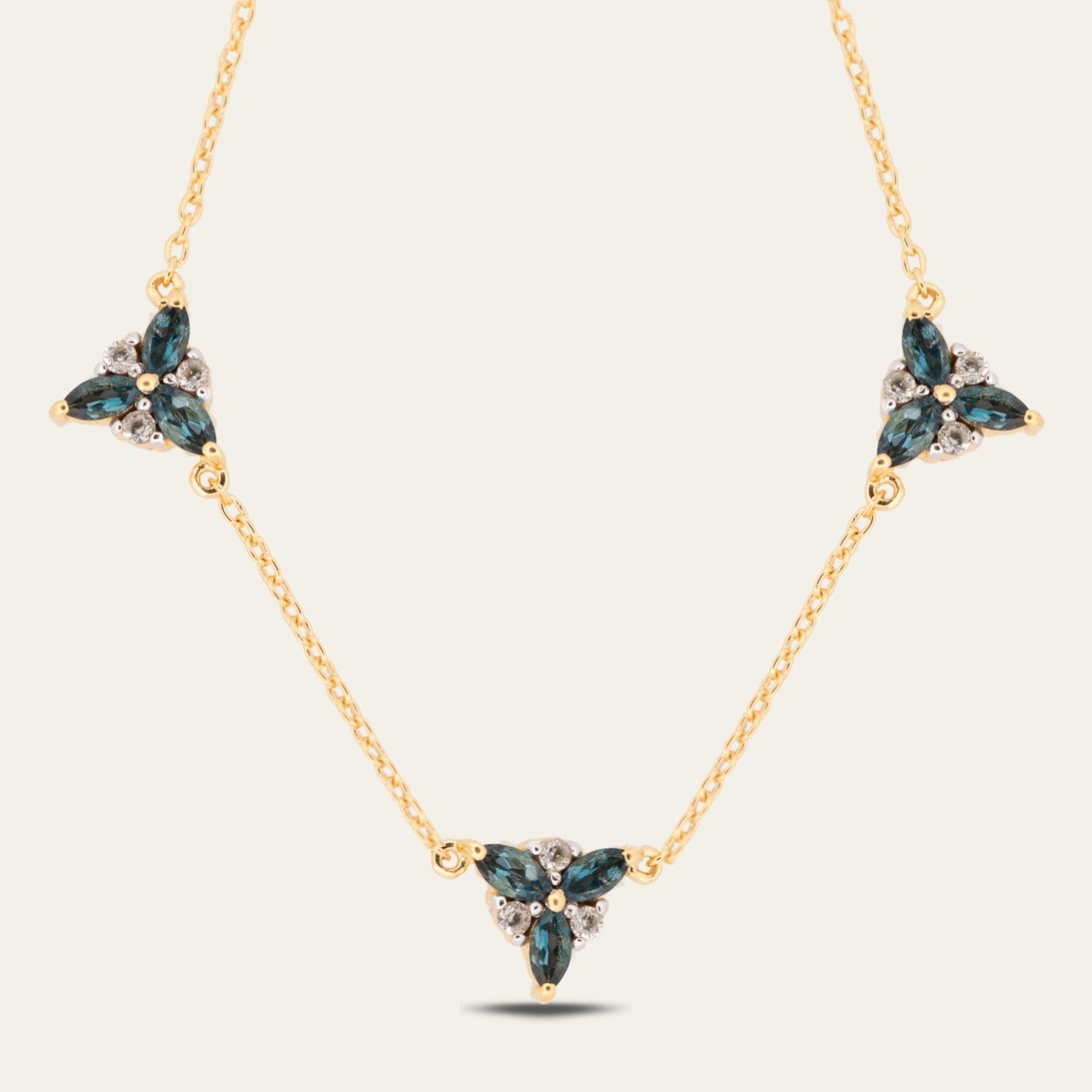 Named after Galene, the enchanting Greek goddess of calm seas, this exquisite necklace has three graceful clusters of London Blue Topaz gemstones delicately arranged in marquise settings, reminiscent of gentle waves catching moonlight. We have then added sparkling white topaz gemstones that sparkle with every movement.
