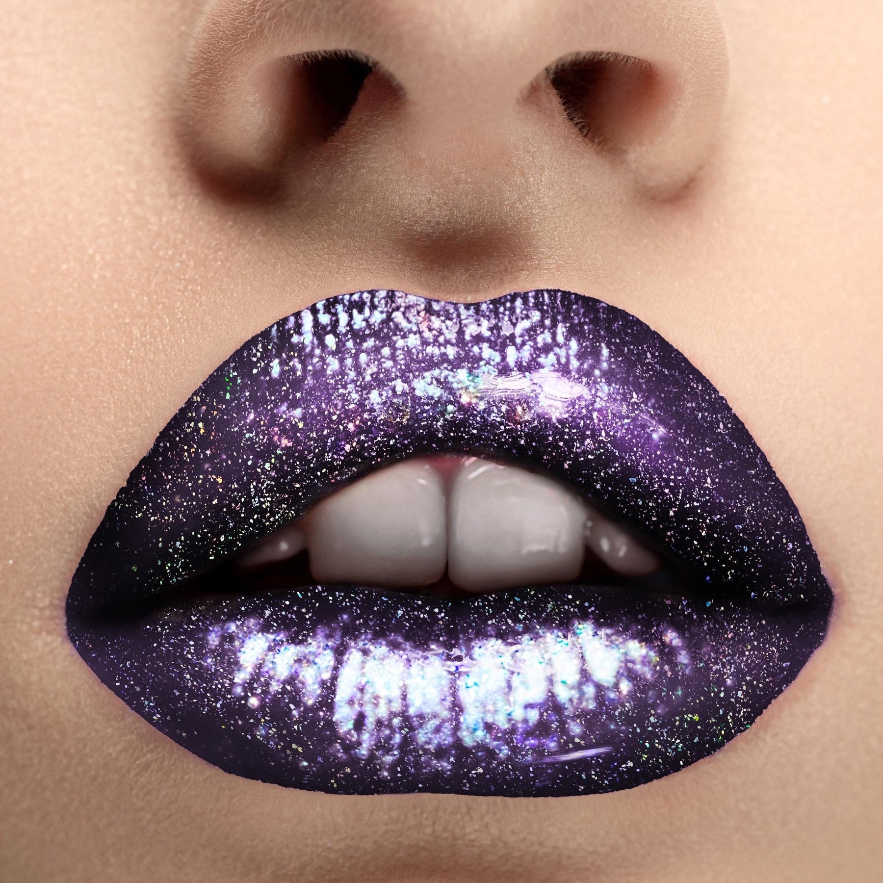 Please note, the main lip swatch image shows summoning over our SPELLBOUND magic metallic liquid lipstick, which is a deep purple. Summoning has a light lilac base with a rainbow holographic glitter, so the underneath lip colour can show through.