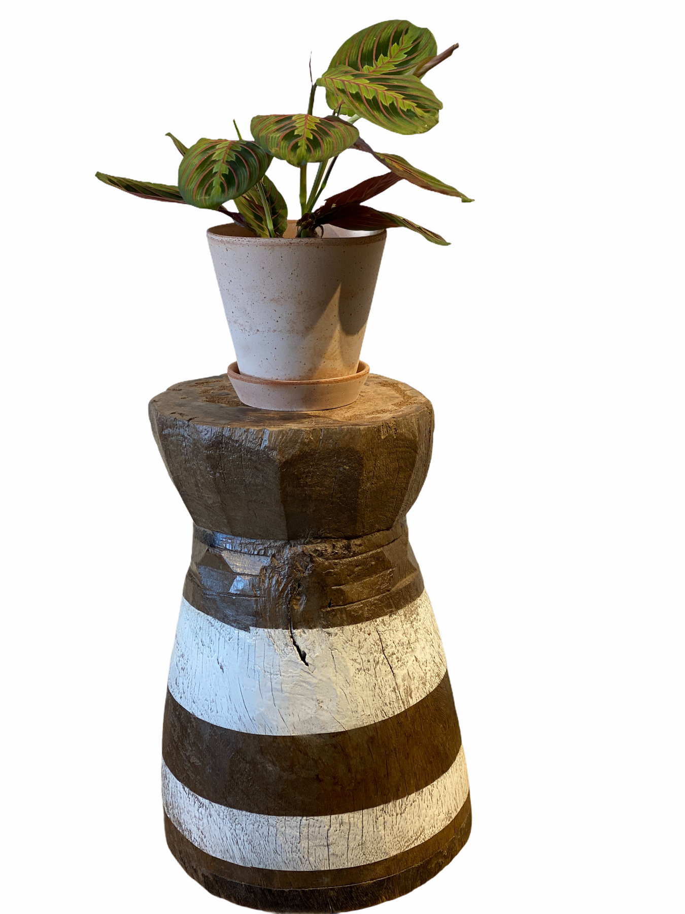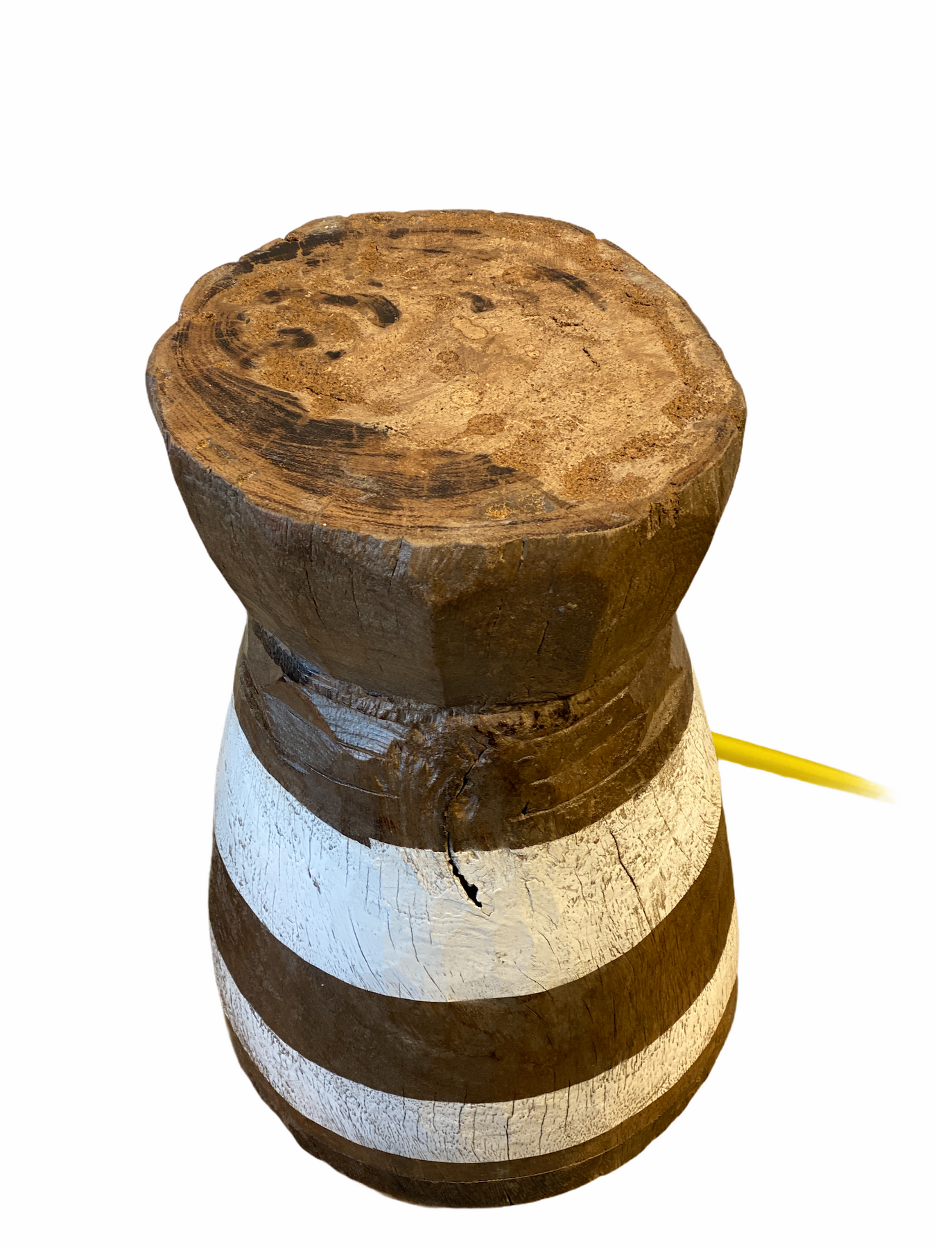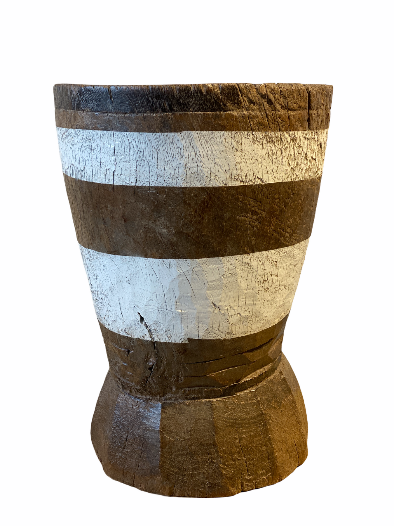 This model has one large opening at the top and the base is solid perfect for use as a small stool or side table.  Painted white stripes and naturally textured surface from the tree trunk it came from.