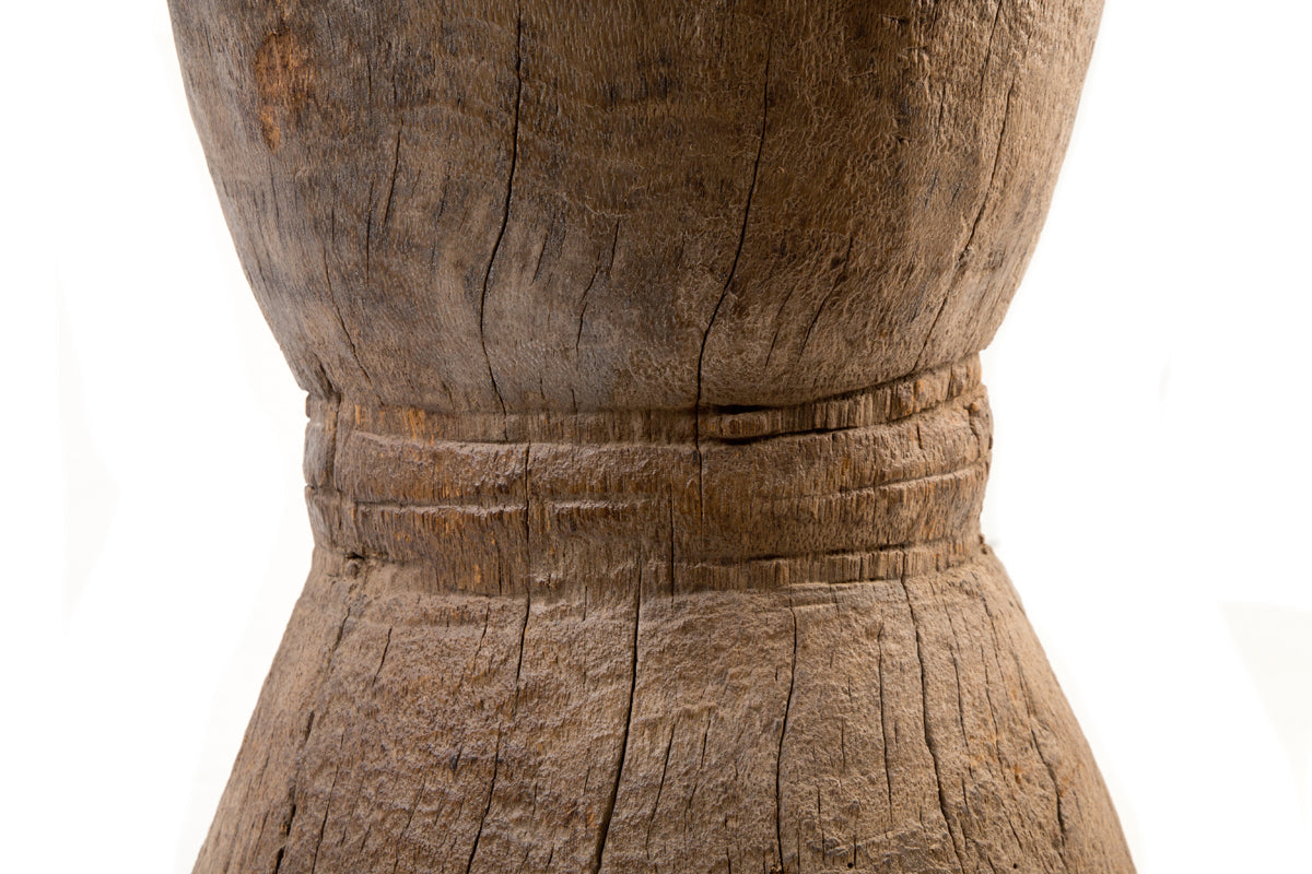 African grain stompers are hand-made when tree trunks are  hollowed out and then used to grind grain. These have been recycled from their original purpose into side tables by adding copper tops.