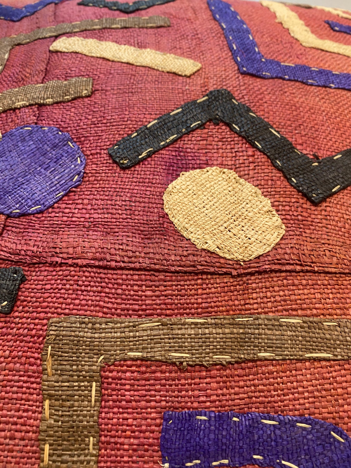 A stunning hand stitched textured cushion made from the fiber of the Raffia Vinifera Palm in the Democratic Republic of Congo.  Production of these textiles is a multistage process which involves the participation of many people, both women and men. The process includes gathering and preparing the raffia fibers for weaving and embroidery, weaving the basic oth unit, dying the embroidery fibers, and embellishing the woven cloth with embroidery, applique, patchwork and dye. Embroided cloth works are individually conceptualised and the patterns have been named and passed on through generations.