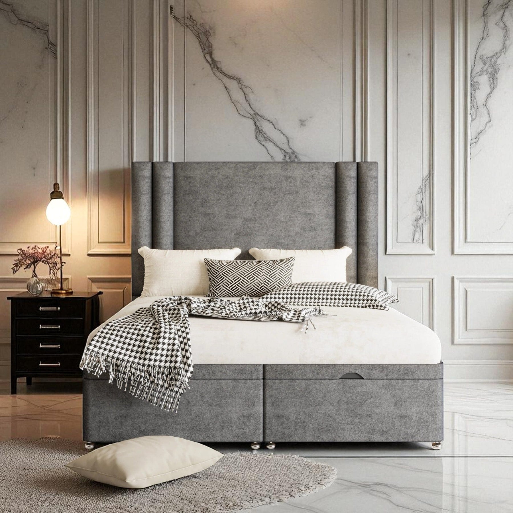 This luxurious Amara Ottoman Divan Bed is exclusive to Divan Bed Warehouse, as part of our CloudLift Collection. Constructed from the highest quality British timber right here in Great Britain, it is presented here in a stylish and contemporary material, designed to be the perfect addition to your bedroom available in 50+ colours and many fabrics. The set includes a luxury mattress of your choice or you can just purchase the bed and Luxurious Floor Standing Headboard.