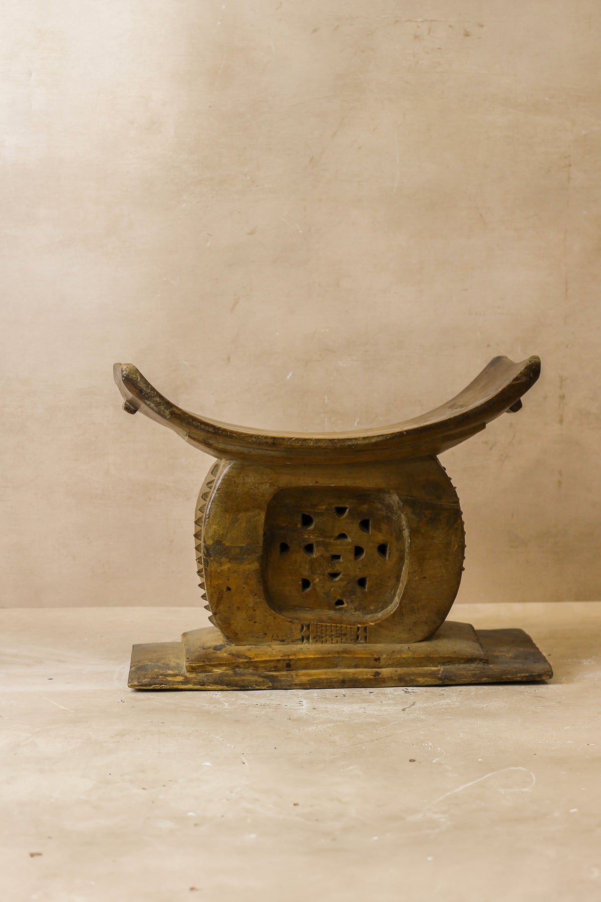 Historic Detail : The Golden Stool is a sacred symbol of the Ashanti nation believed to possess the sunsum (soul) of the Ashanti people. ... These stools were made for chiefs and important people and were considered important state regalia. They were believed to contain the soul of the owner. The seats were crescent-shaped, and the stool was carved from a single piece of wood, reflecting the skill and talent of the stool carvers and not nailed together like European chairs. Among the Akan, a well-carved stool serves multiple purposes, in addition to providing a well-designed seat to sit upon. Among the Akan, when a daughter reaches the age of puberty, her father is expected to give her a stool that becomes not only her property, but also identification with her soul and being. Often stools will be seen with their upper corners worn from being leaned up against the wall or laid down on their sides, all to prevent someone else from sitting on it or worse a malevolent spirit could take charge of the stool and the owner’s spirit. Stools start out as a white wood and through time take on a burnished and well-worn hue. Designs of stools may vary depending on the inventiveness of the stool carver, and today many of the historical forms are either forgotten or interpreted anew.