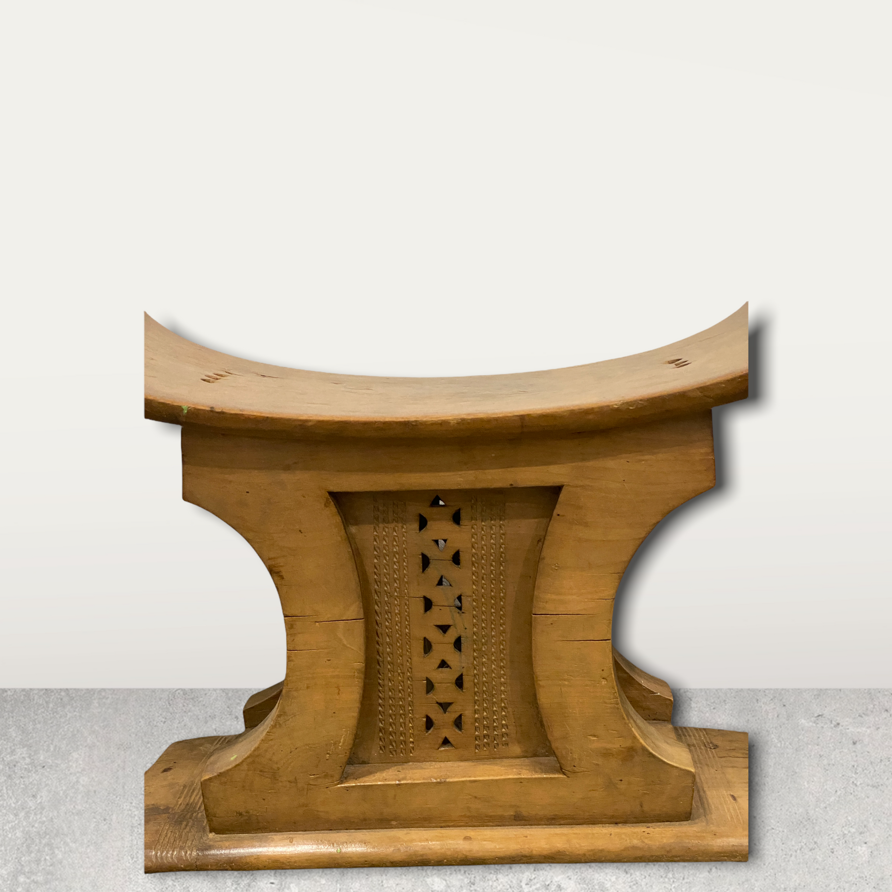 The Golden Stool is a sacred symbol of the Ashanti nation believed to possess the sunsum (soul) of the Ashanti people. ... These stools were made for chiefs and important people and were considered important state regalia. They were believed to contain the soul of the owner. The seats were crescent-shaped, and the stool was carved from a single piece of wood, reflecting the skill and talent of the stool carvers and not nailed together like European chairs. Among the Akan, a well-carved stool serves multiple purposes, in addition to providing a well-designed seat to sit upon. Among the Akan, when a daughter reaches the age of puberty, her father is expected to give her a stool that becomes not only her property, but also identification with her soul and being. Often stools will be seen with their upper corners worn from being leaned up against the wall or laid down on their sides, all to prevent someone else from sitting on it or worse a malevolent spirit could take charge of the stool and the owner’s spirit. Stools start out as a white wood and through time take on a burnished and well-worn hue. Designs of stools may vary depending on the inventiveness of the stool carver, and today many of the historical forms are either forgotten or interpreted anew.