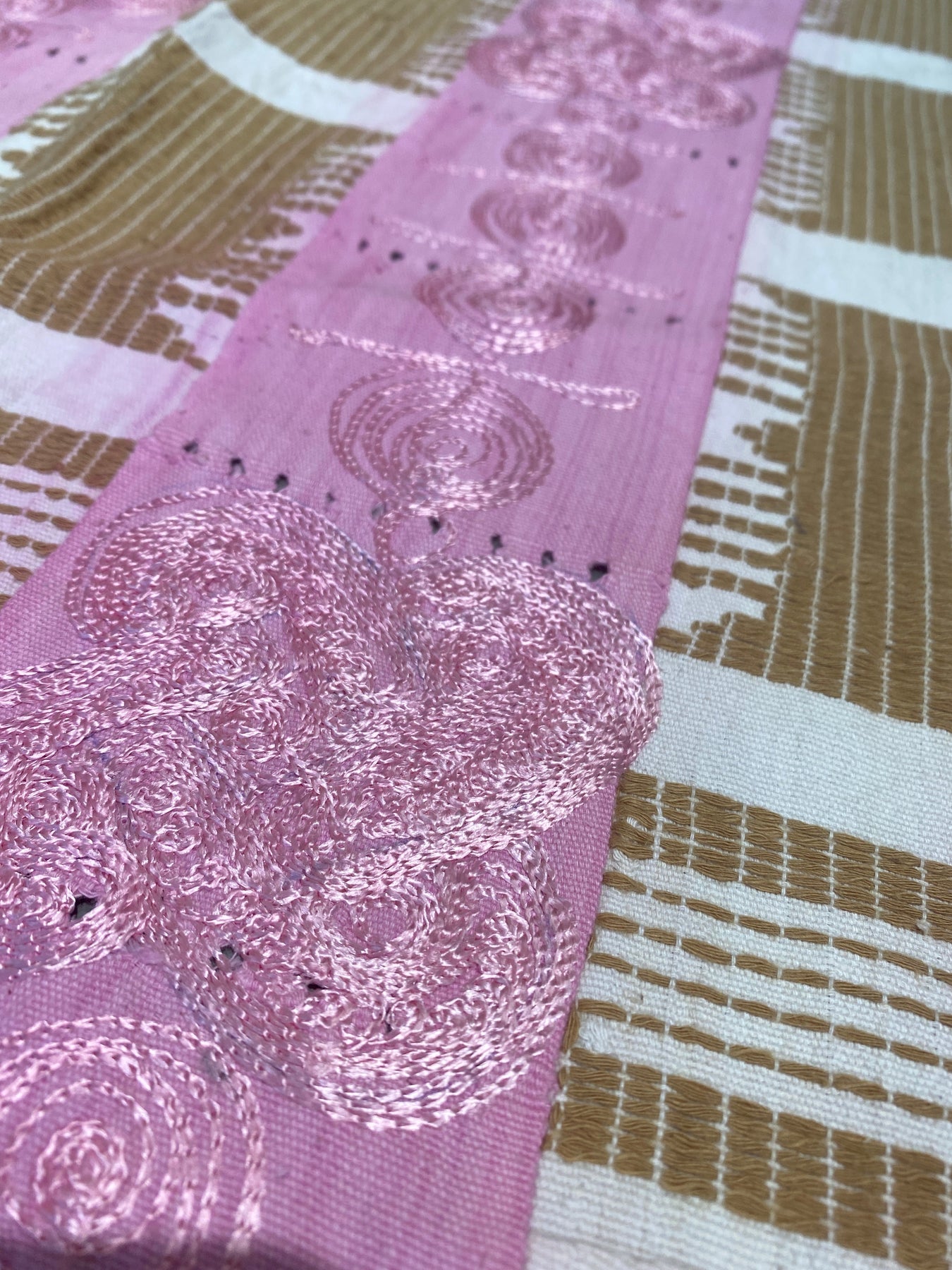 A stunning hand stitched piece of cloth from the Yoruba people of west Africa.  The Oko means “top cloth” meaning cloth of high status. The fabric is also used to make men’s gowns called agbada and hats called Fila and women’s wraps called iro.