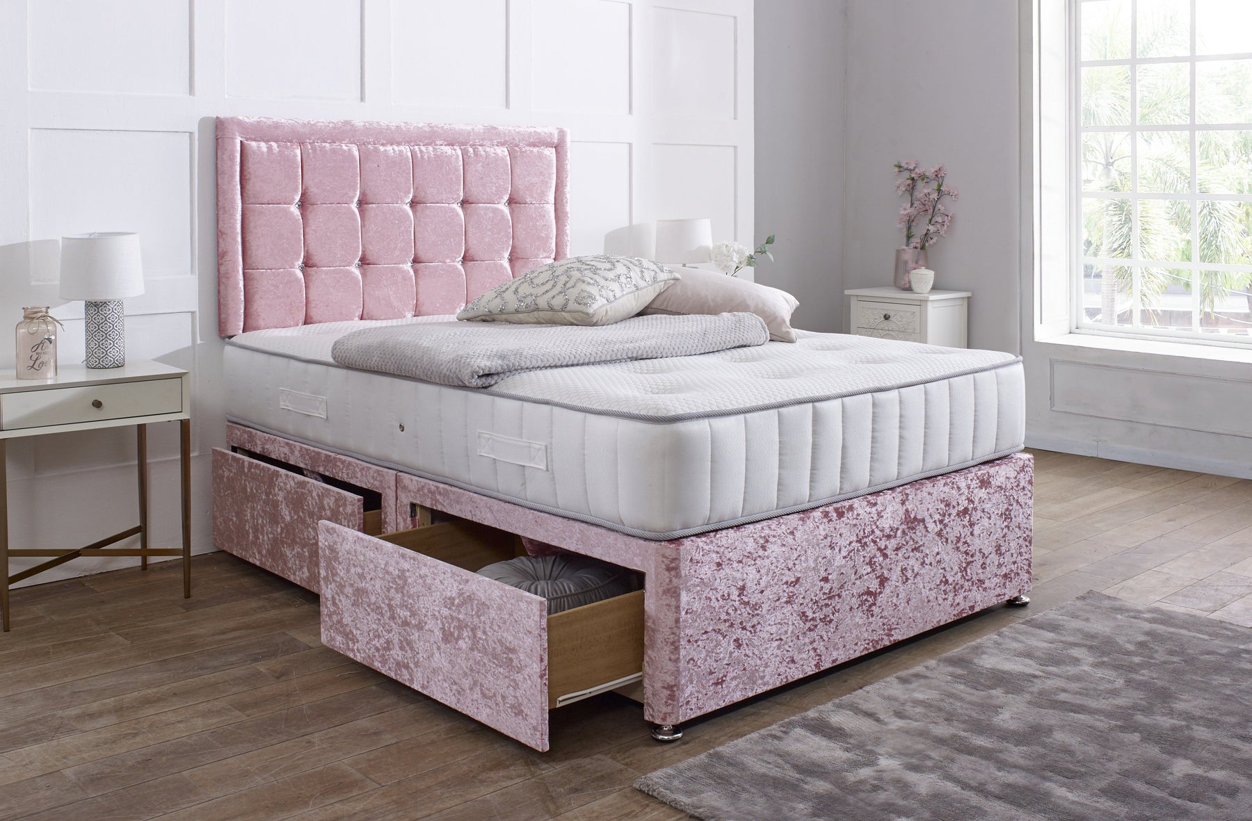 The Divan Bed Base features 4 beautifully positioned chrome gliders as feet and also a number of chrome elements on the divan bed base itself in order to add a hint of elegance and style to your bedroom. The set includes a luxury mattress of your choice. Includes Hand Crafted and Pleated Fabric Button or Diamanté Headboard.