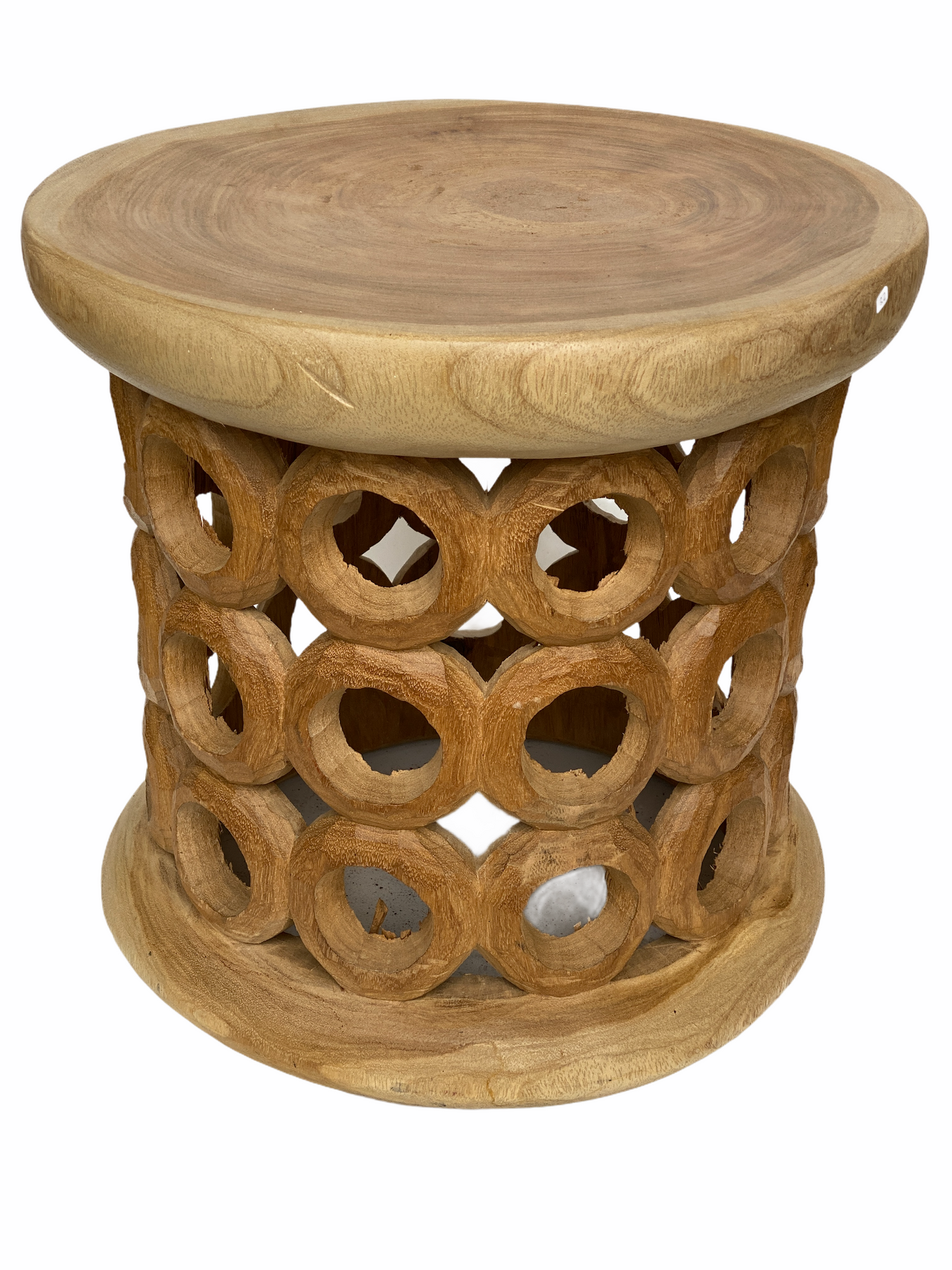 The seat/table is the most important piece of furniture in Africa, usually corresponding to his social rank. The craftsmen of the Bamileke are famed for their skill in woodcarving. They create a variety of remarkable round stools with repetitive openwork designs, all carved out of one tree trunk stump. This is a table piece with a hand carved intricate pattern.