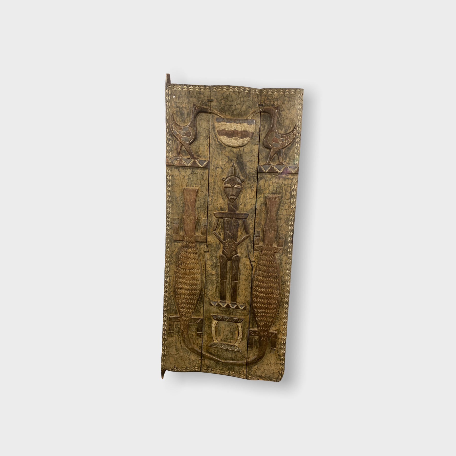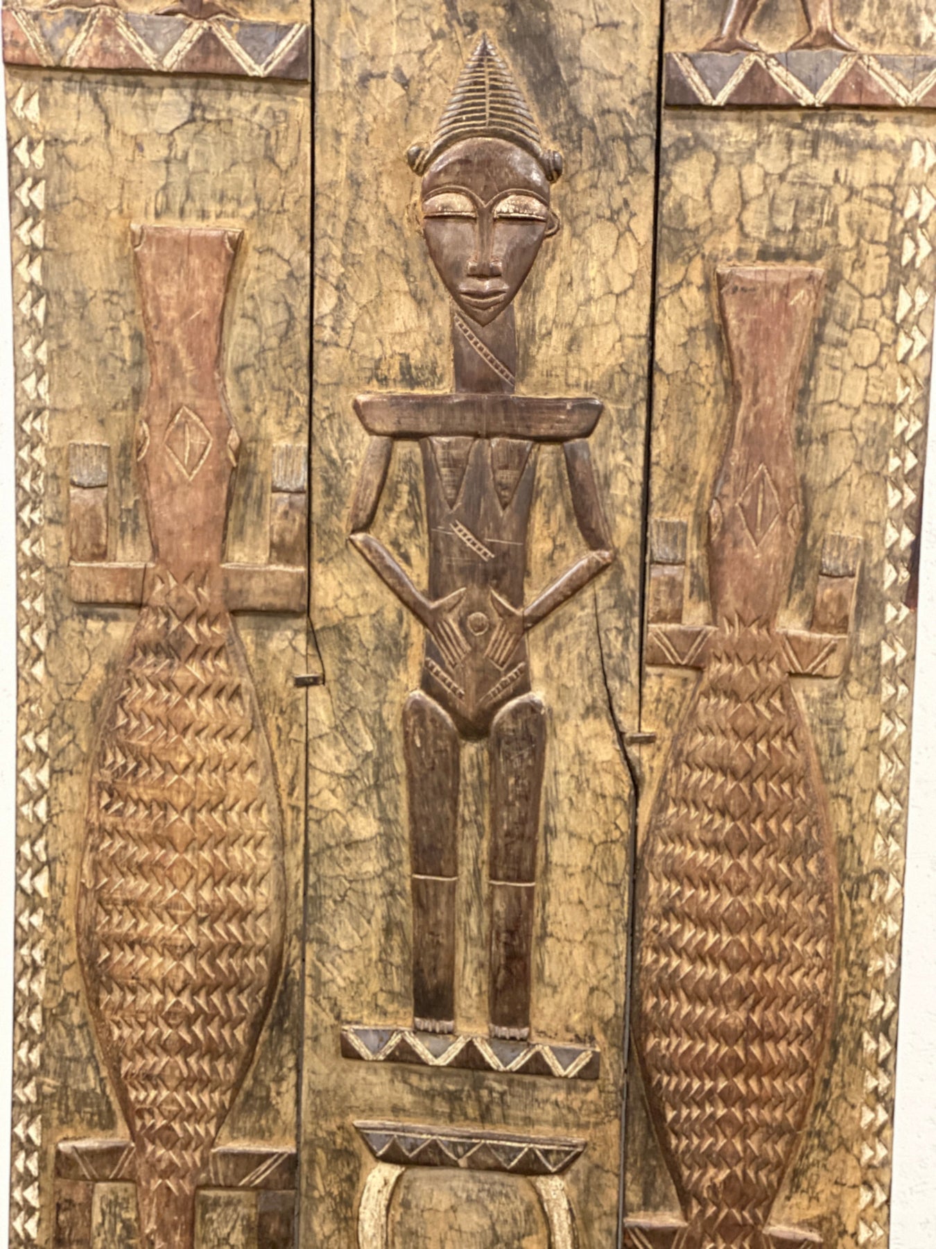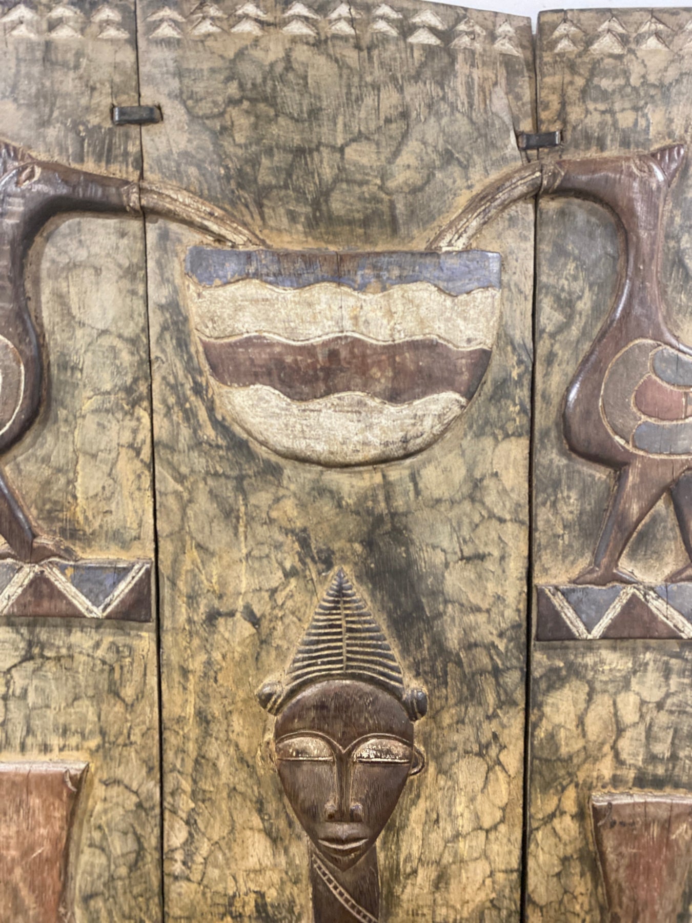This Baule traditional very old door is embellished with objects which facilitate the relationship between the living world and spiritual.  They are known as Anuan, showing hand carved animal and human and sometimes vegetation motifs.  They were once used as entrance doors to courtyard houses.