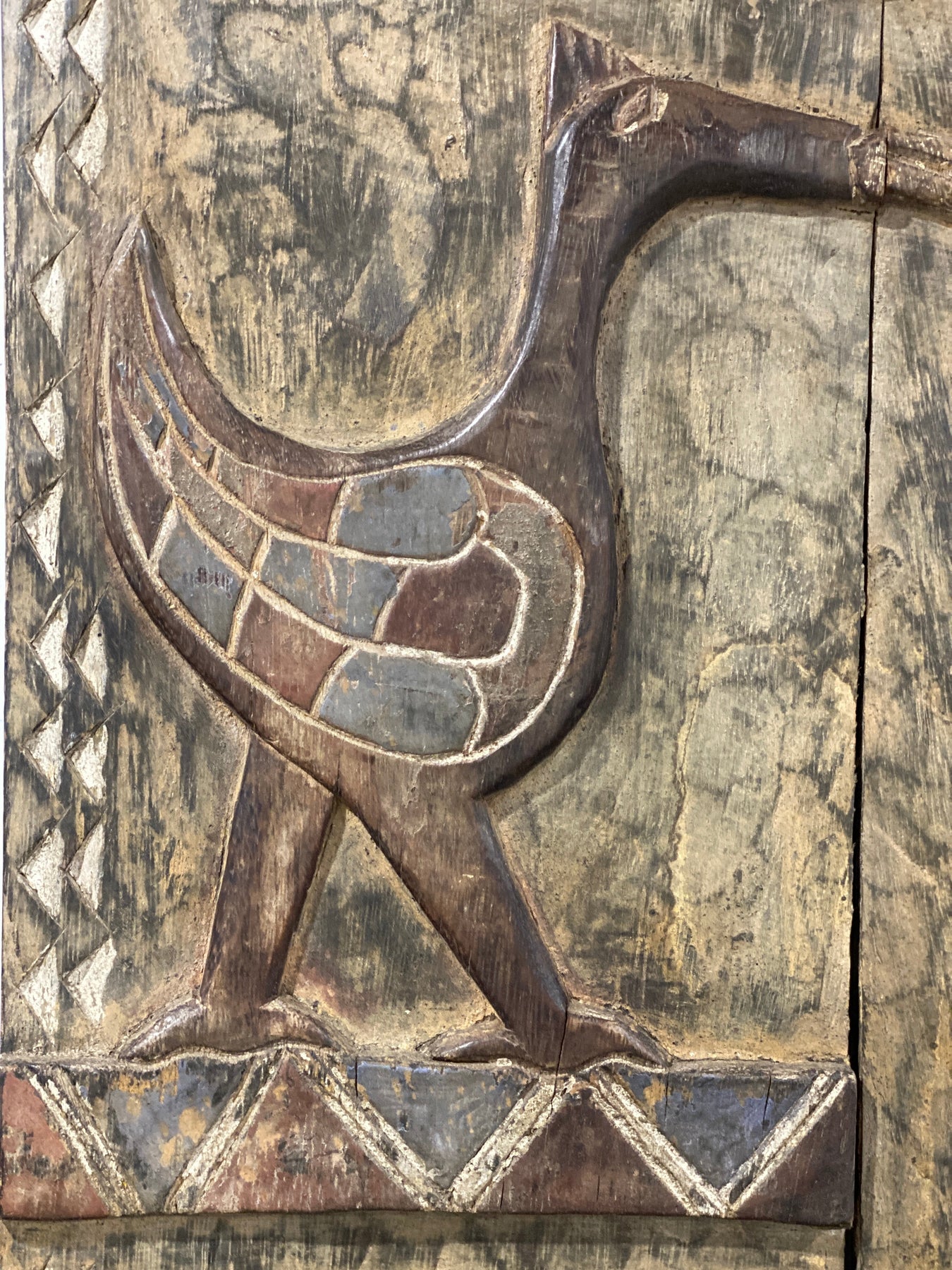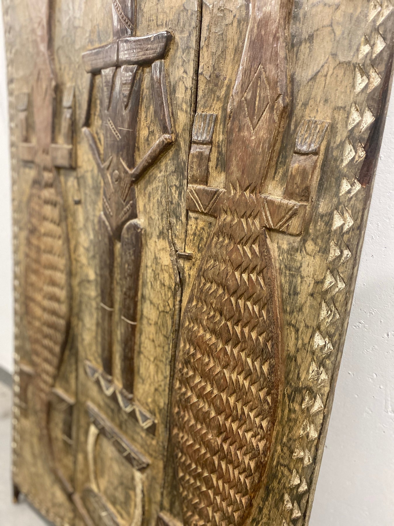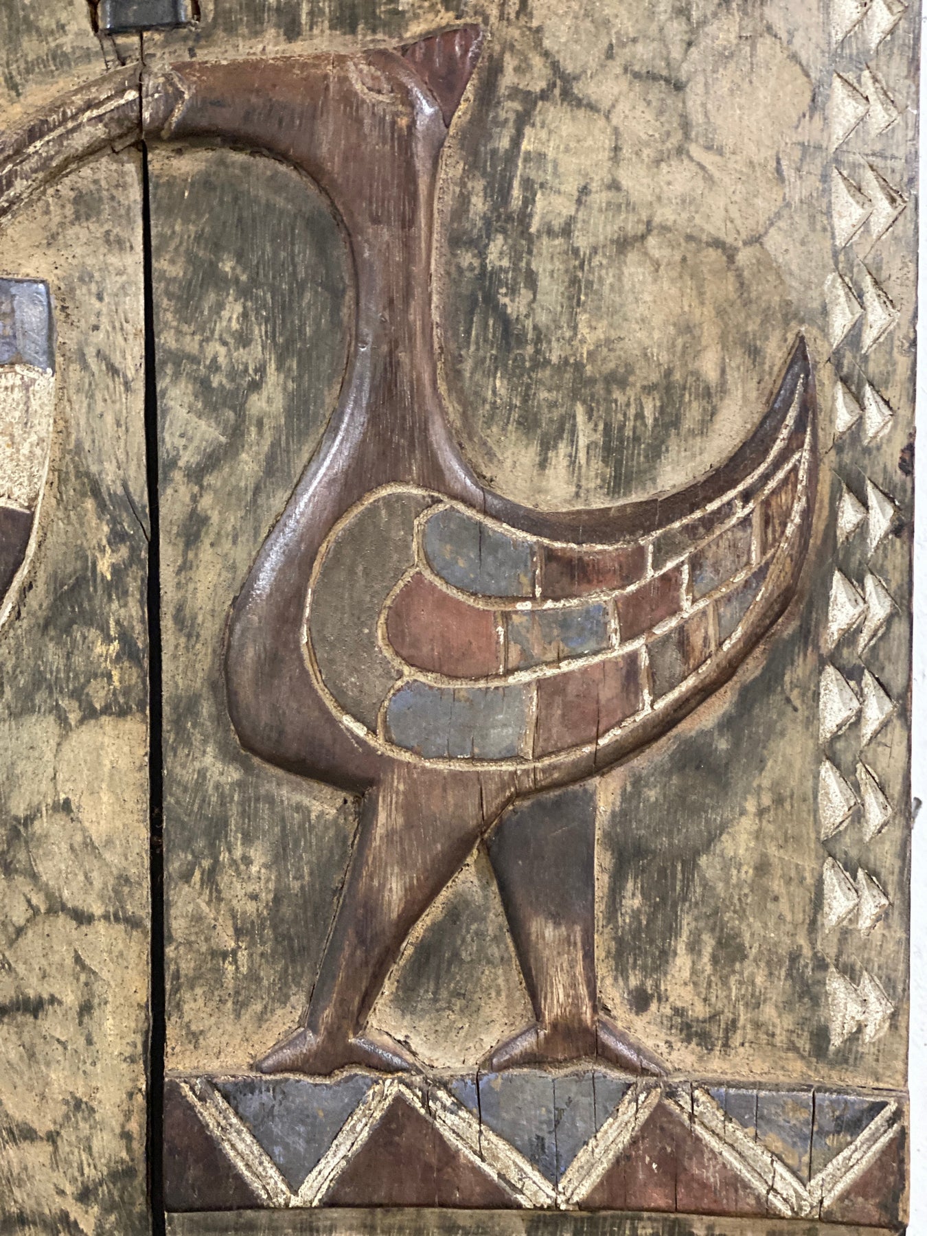 This Baule traditional very old door is embellished with objects which facilitate the relationship between the living world and spiritual.  They are known as Anuan, showing hand carved animal and human and sometimes vegetation motifs.  They were once used as entrance doors to courtyard houses.