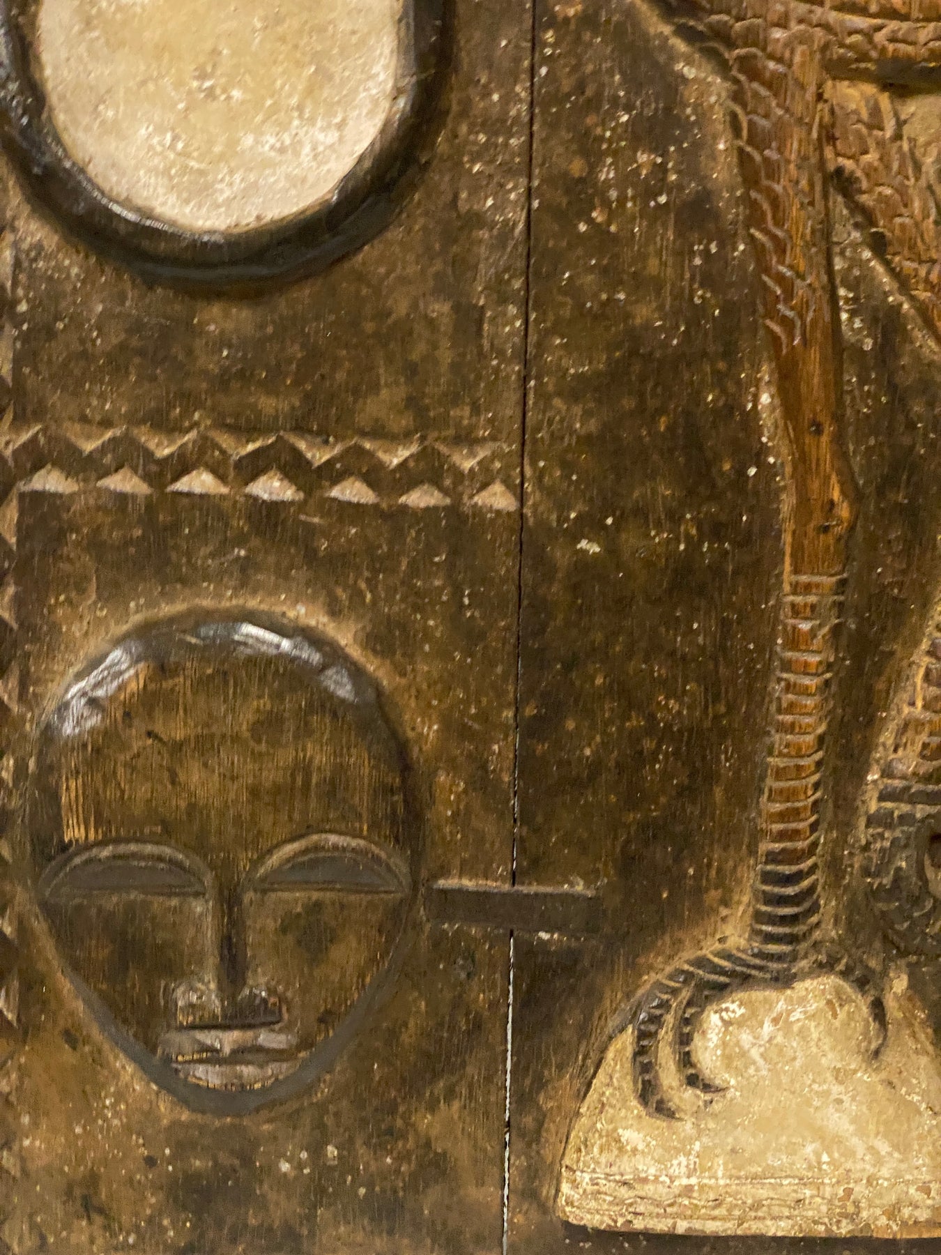 This Baule traditional very old door is embellished with objects which facilitate the relationship between the living world and spiritual.  They are known as Anuan, showing hand carved animal and human and sometimes vegetation motifs.  They were once used as entrance doors to courtyard houses.