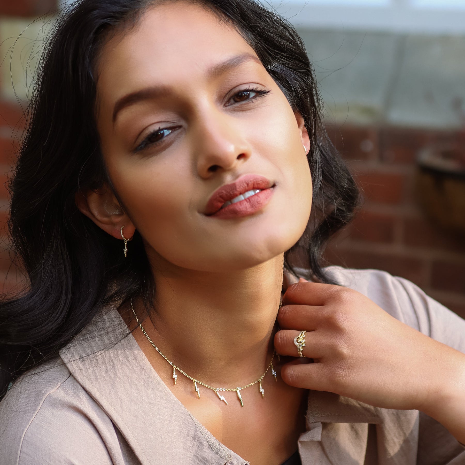 Make a striking impact in this delicate gold chain necklace featuring 7 lightning bolt shaped charms detailed with pave crystals. Perfect for layering!