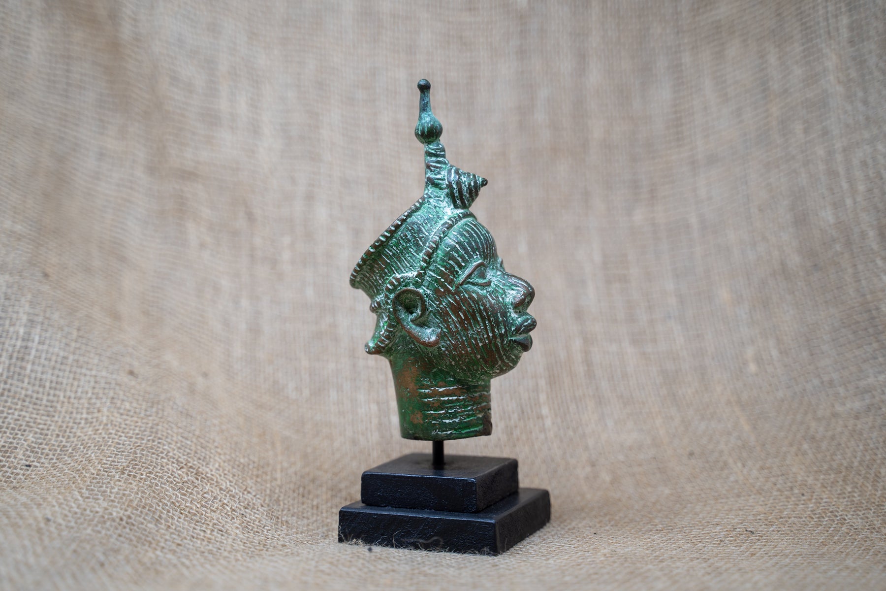 Benin sculptures are made using the lost-wax method of casting.  This means only one unique items can be made from each wax model. The wax model is carefully covered in clay. This is then heated to set the clay and melt the wax. Molten metal is then poured into the clay mould. Once it cools the clay is chipped away, leaving the bronze sculpture.