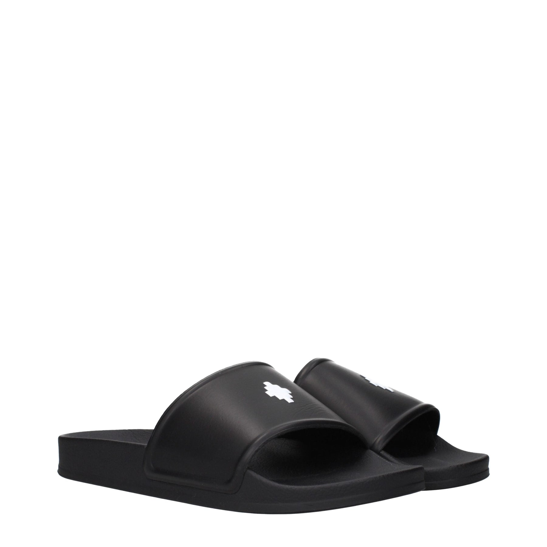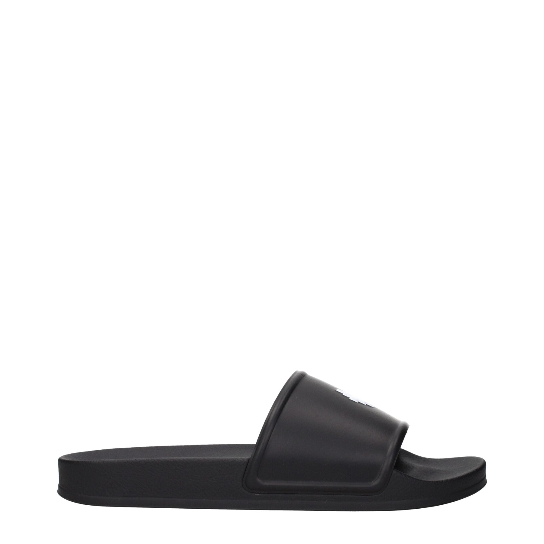 The product with MPN CMIC001MAT001100 and code F84874 rubber in black is a slippers and clogs designed by Marcelo Burlon. It has features like front logo.