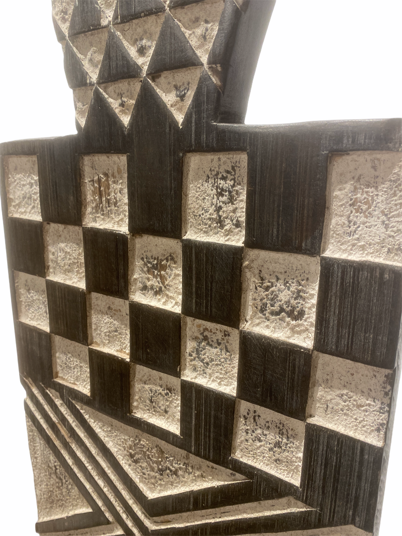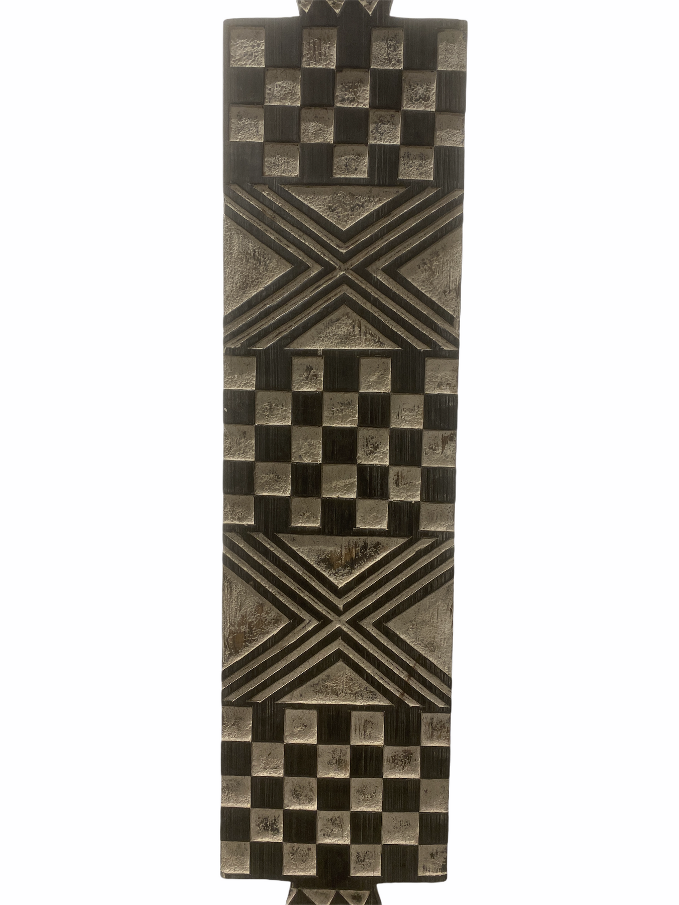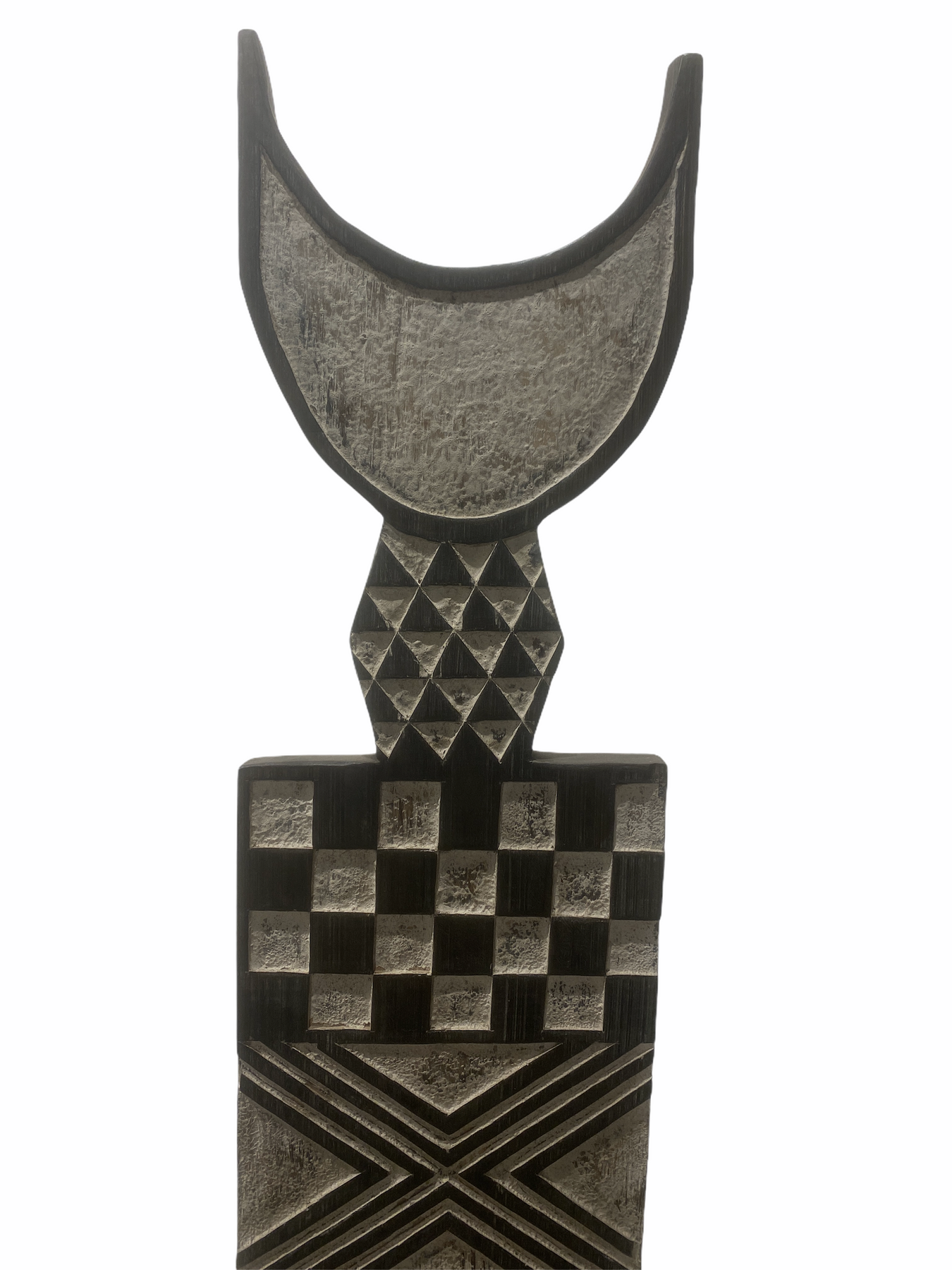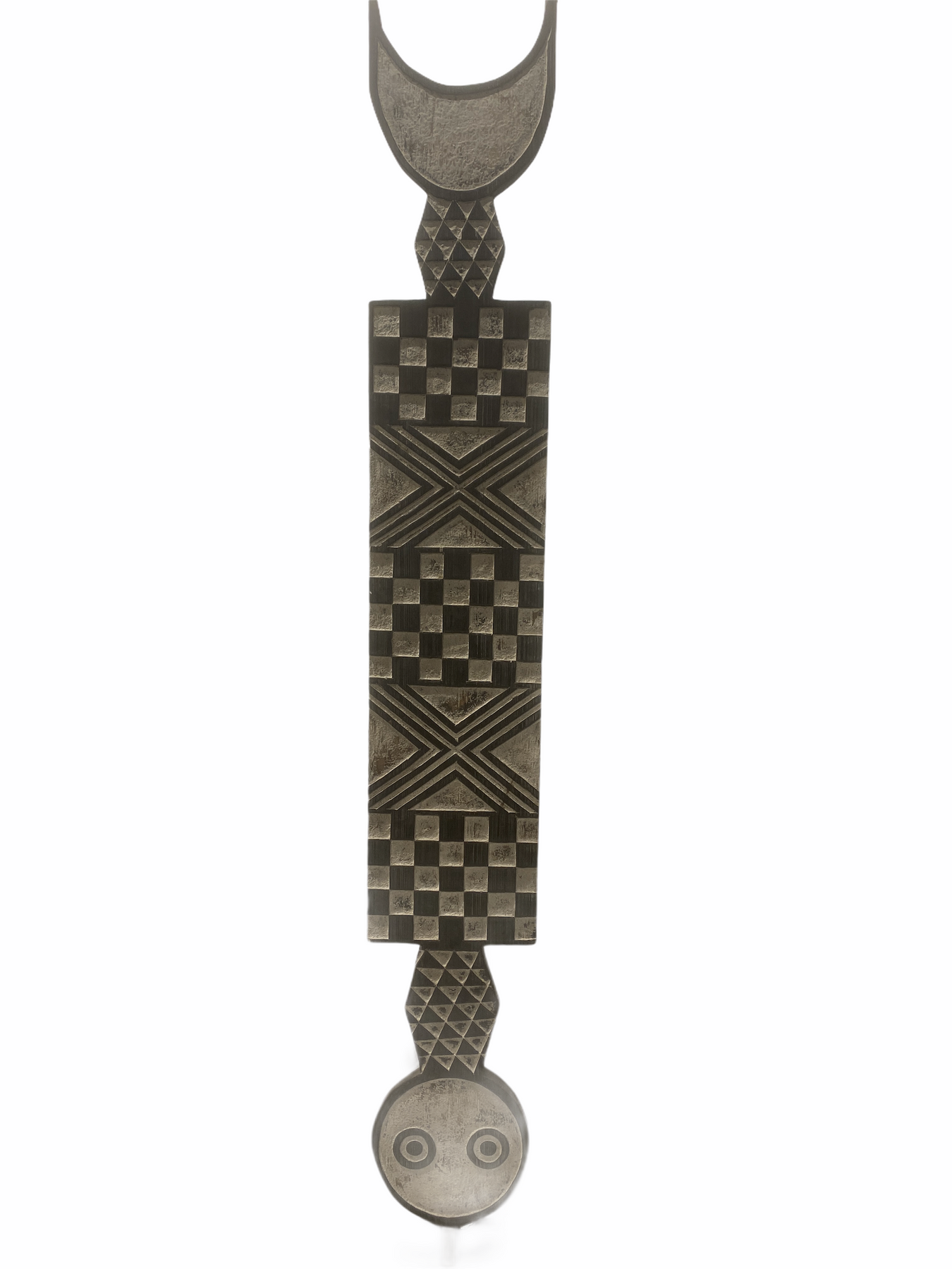 These fine and superb plank mask named Nwantantay, is handcrafted and used by the southern Bwa ethnic group, south of Dedougou in Burkina Faso. It is presumed to represent nature spirits that the family elders encountered in the wilderness, and which watch over their families. The zig-zag lines  on the mask represent the path of the ancestors that all Bwa must follow if they are to overcome adversity. The concentric circles are the sacred wells in one town that are said to be the “water spirit”. The masks are used for entertainment during market days, for initiation of young adults, and at annual yam festivals. The dancers appear wearing thick costumes of brightly dyed hemp fibre.