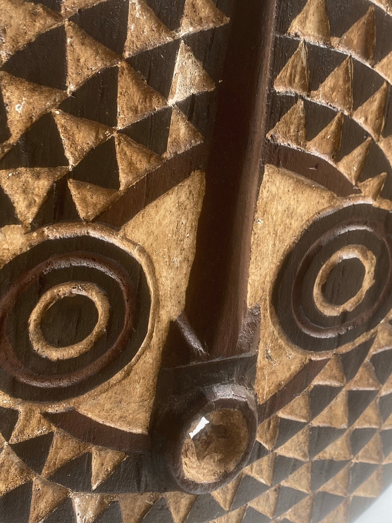 Sun Masks appear during agricultural and harvest festivals among the Bobo people. They honour the Sun and its power to yield a healthy crop. The chequer-board light and dark geometric atterns are understood and interpreted in increasingly complex ways depending on the observer. The use of light and dark pigments represents dichotomy of innocence and knowledge. The highly abstracted and geometric forms of the Bwa and Bobo played an important inspirational role in the development of Western art movements of the early 20th century.
