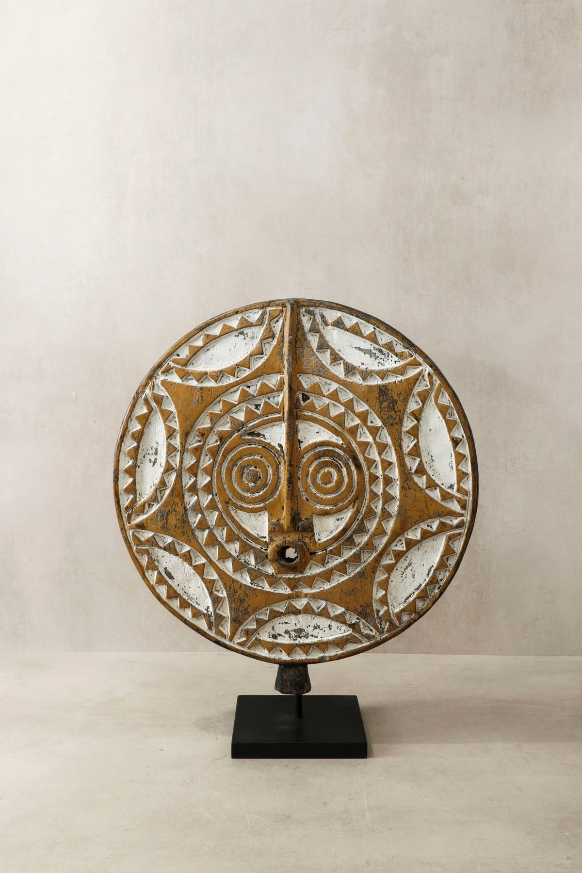 Sun Masks appear during agricultural and harvest festivals among the Bobo people. They honour the Sun and its power to yield a healthy crop. The chequer-board light and dark geometric atterns are understood and interpreted in increasingly complex ways depending on the observer. The use of light and dark pigments represents dichotomy of innocence and knowledge. The highly abstracted and geometric forms of the Bwa and Bobo played an important inspirational role in the development of Western art movements of the early 20th century.