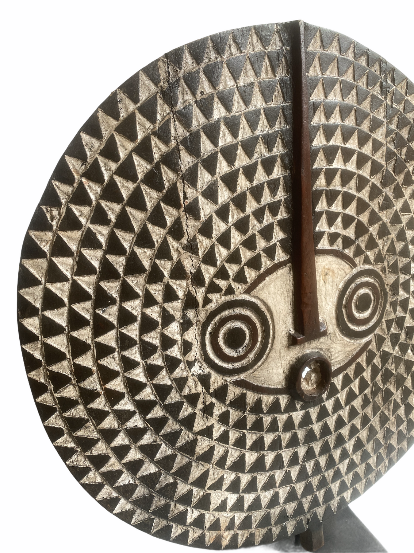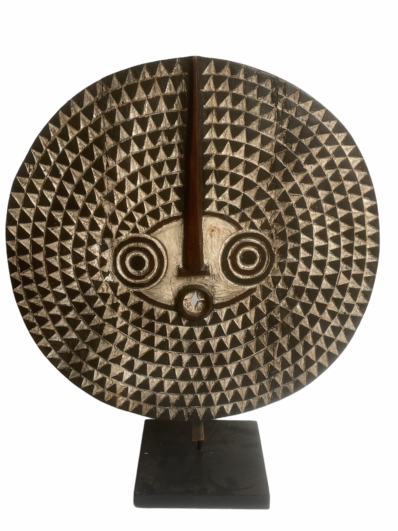 Sun Masks appear during agricultural and harvest festivals among the Bobo people. They honour the Sun and its power to yield a healthy crop. The chequer-board light and dark geometric atterns are understood and interpreted in increasingly complex ways depending on the observer. The use of light and dark pigments represents dichotomy of innocence and knowledge. The highly abstracted and geometric forms of the Bwa and Bobo played an important inspirational role in the development of Western art movements of the early 20th century.