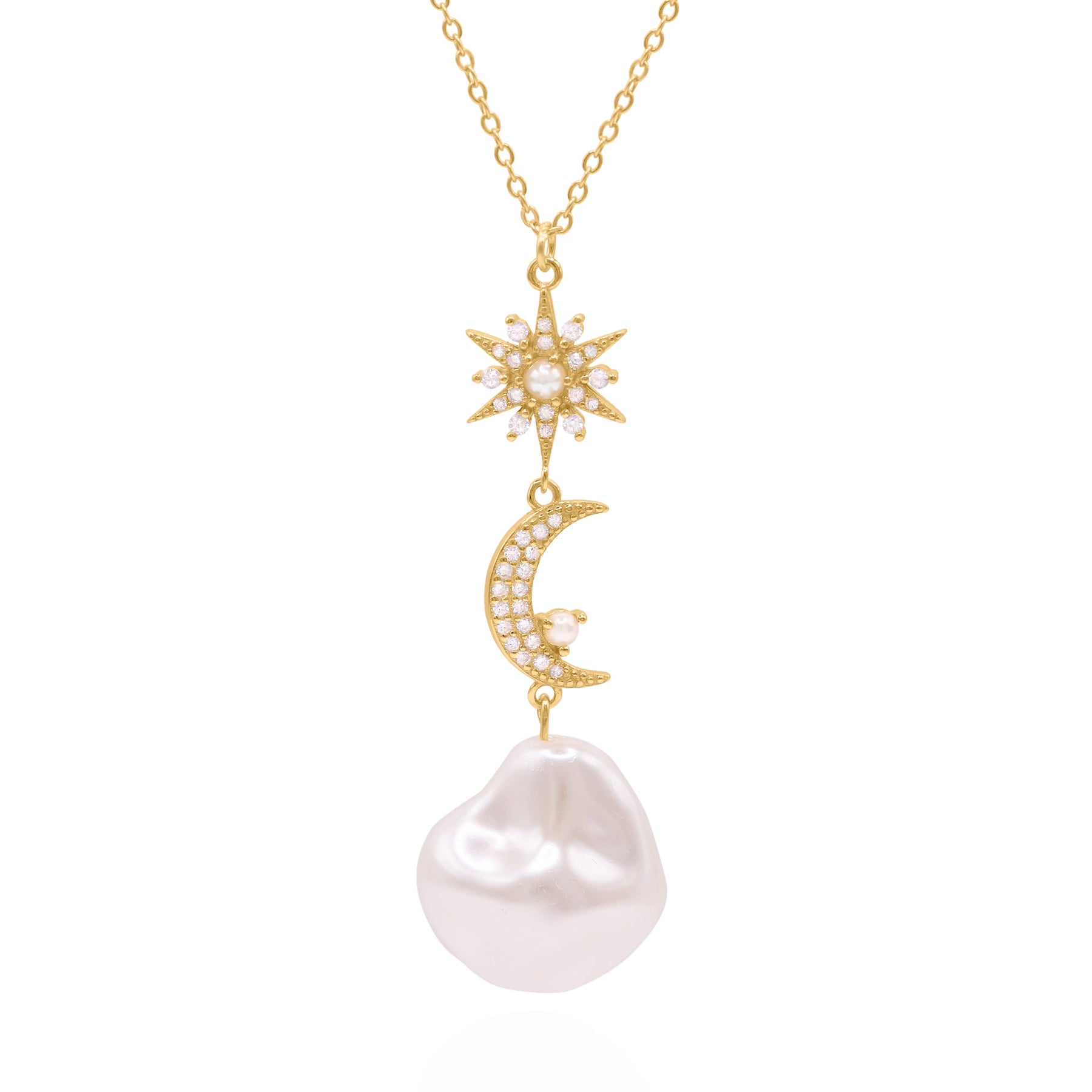 Bronte is a gorgeous mix of timeless classic meets celestial style. She features a pave crystal adorned north star & crescent moon each with a small pearl stone dropped from a gold vermeil chain. Hanging underneath the celestial charms is a large pearl adding a beautiful finishing touch.