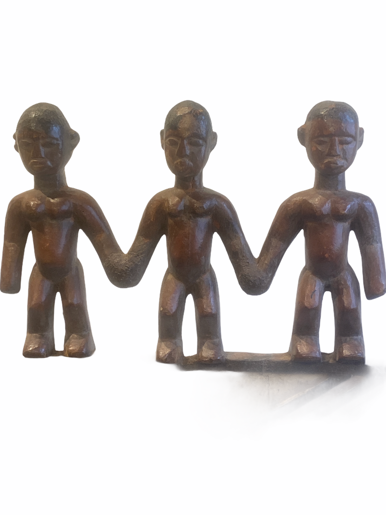 This mask shows three sculptured figures holding hands.