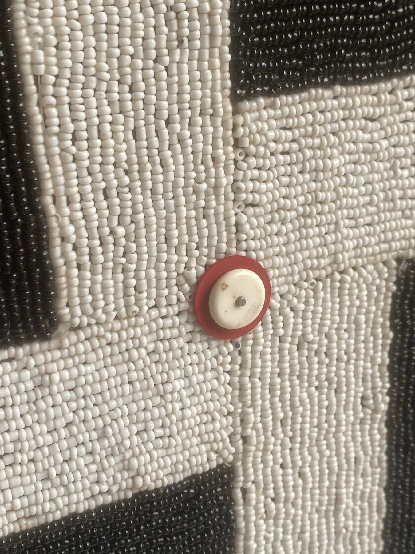 Historically used as a defensive weapon in wartime and displayed as a decorative symbol of status and wealth by the Tikar people in Cameroon. Meticulously crafted, carved from one solid piece of Baobab wood, a sacred wood used for medicinal and ritual purposes for centuries, this large shield boasts hundreds of hand-placed beads on manila string in a circular pattern around a dimensional cluster of natural cowrie shells in the centre. These decorative shields are one-of-a-kind, collaboratively crafted by a large group of people to make each piece truely unique and