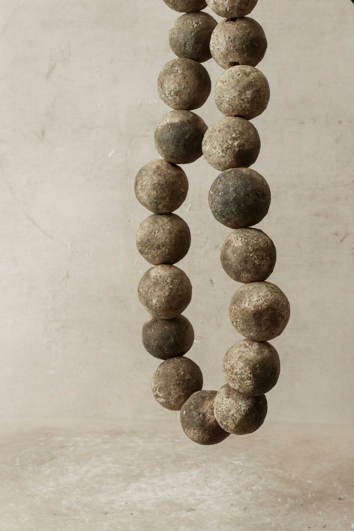 The Cameroonian clay bead necklace, elegantly showcased on a stand, represents the artistic essence of Cameroon's culture. Handcrafted from local clay, these beads are in earthy colours. This necklace is a beautiful fusion of art and tradition, offering a glimpse into the rich cultural heritage of Cameroon.