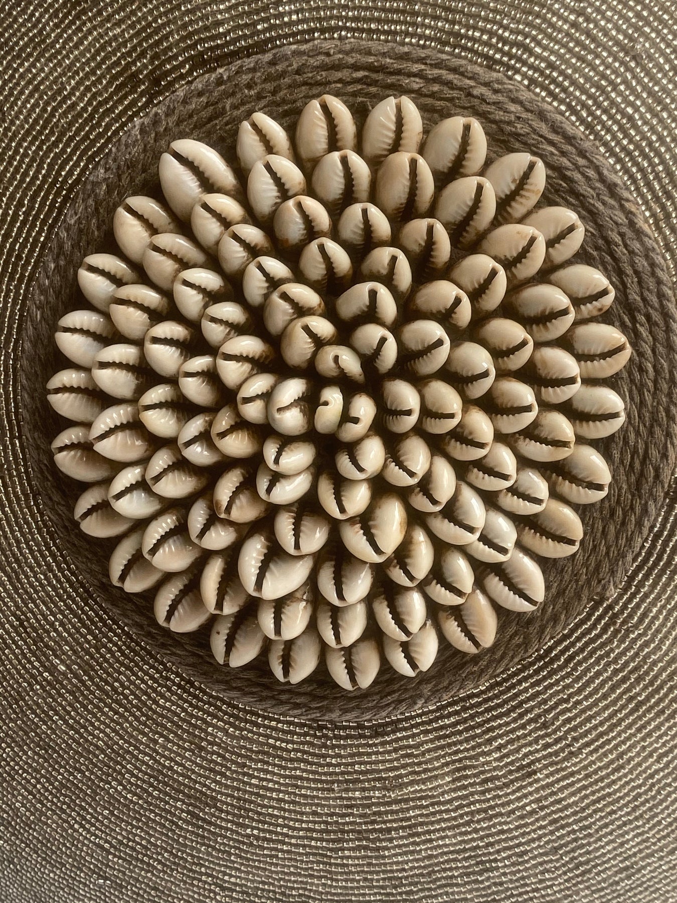 Historically used as a defensive weapon in wartime and displayed as a decorative symbol of status and wealth by the Tikar people in Cameroon. Meticulously crafted, carved from one solid piece of Baobab wood, a sacred wood used for medicinal and ritual purposes for centuries, this large shield boasts hundreds of hand-placed beads on manila string in a circular pattern around a dimensional cluster of natural cowrie shells in the centre. These decorative shields are one-of-a-kind, collaboratively crafted by a large group of people to make each piece truely unique and