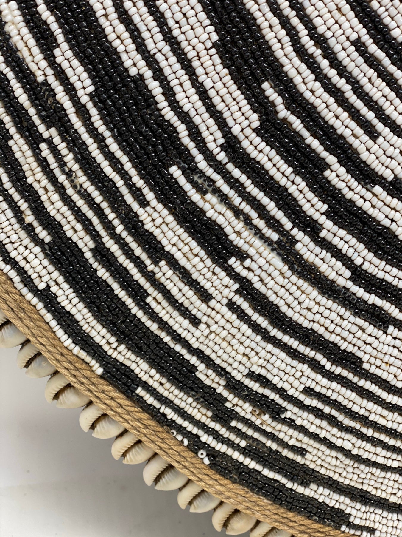 Features thousands of small pearly white beads with a central cluster of Cowrie Shells.  This is a piece that can be hung on a wall or on the stand.