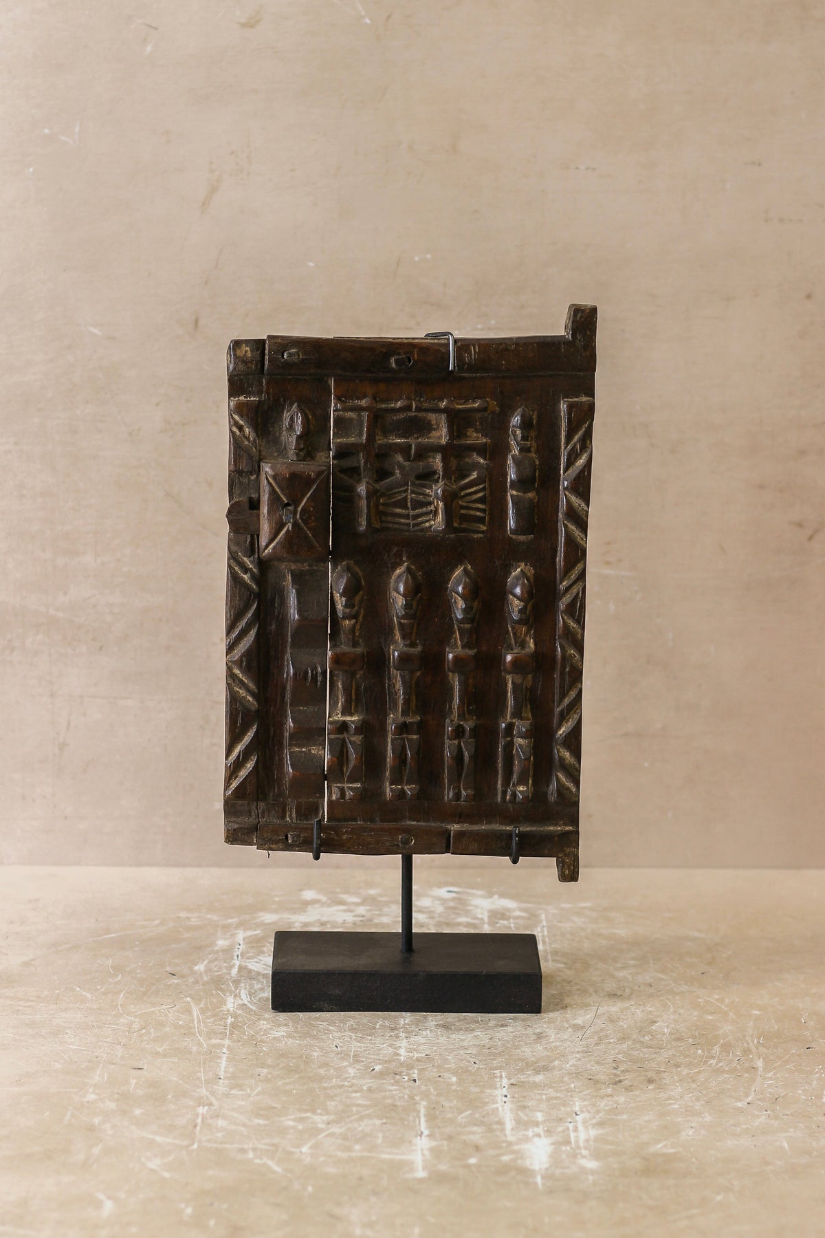 Dogon granary doors originate from the Dogon people of the Bandiagara Escarpment region of Mali. These doors protected the window-like opening into each family's grain storage building, and used a simple. sliding door lock. Primordial beings, ancestors, Kanaga masks, sun lizards and scenes of life symbolically. served to protect the entrance by making it sacrosanct.